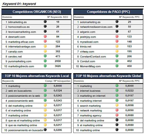En definitiva, ¿quieres que tus clientes te encuentren más fácilmente en Internet y así poder mejorar la notoriedad de tu marca e incrementar el nivel de ventas? Si tu respuesta es SI, nosotros podemos ayudarte a conseguirlo, trabajamos desde 1998 en este sector y estamos muy cerca (Navarra, Madrid, Tarragona y Cochin "India"), aplicamos novedosas metodologías de Inteligencia Competitiva Online (o análisis de la competencia) para ayudarte a conocer la situación real de tu negocio en Internet. Conocer tu posición en relación con los resultados de los competidores te permitirá identificar oportunidades y marcar estrategias de mejora. Si quieres ver un informe completo haz clic aquí |